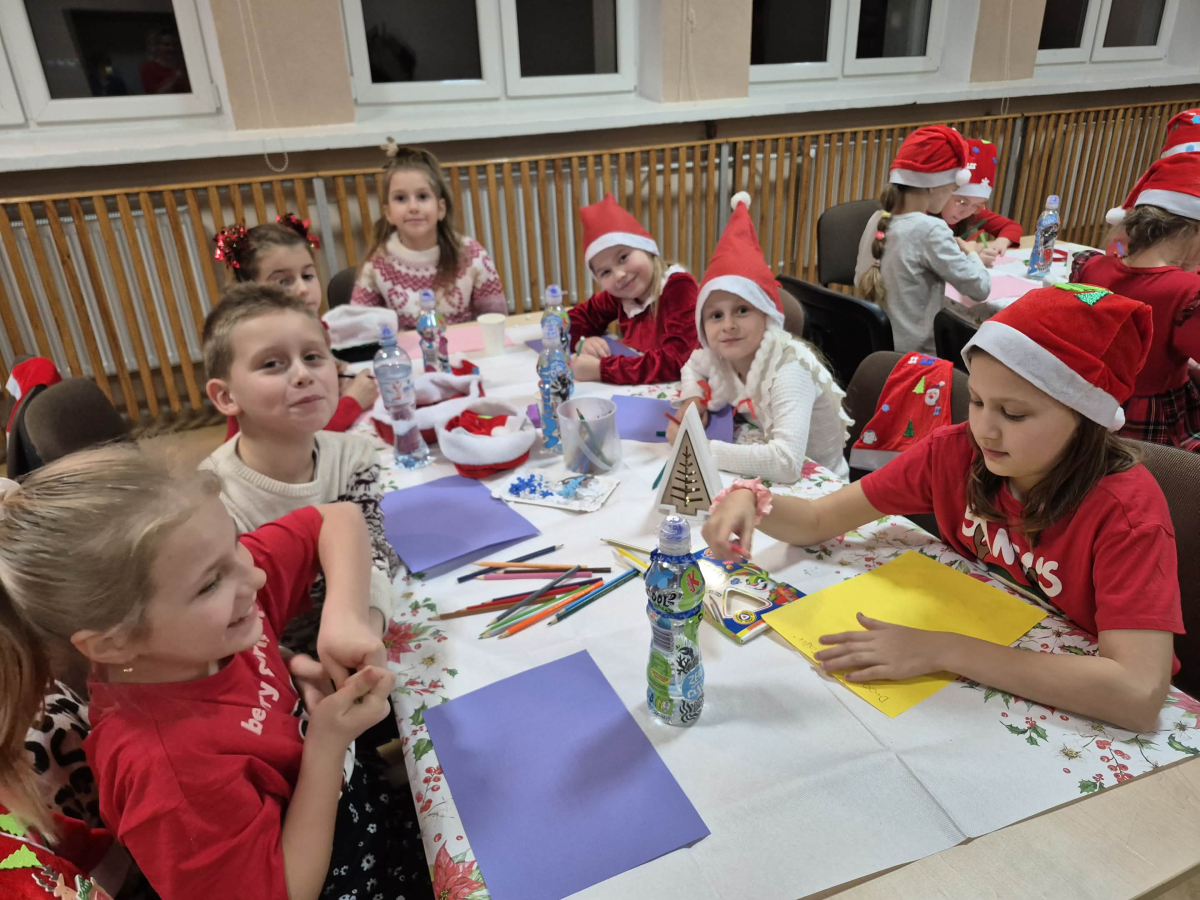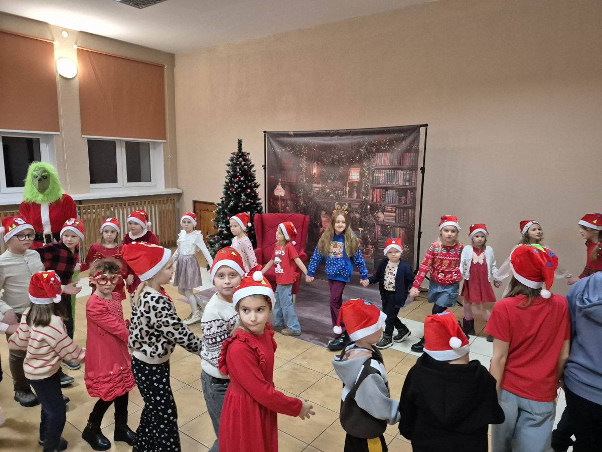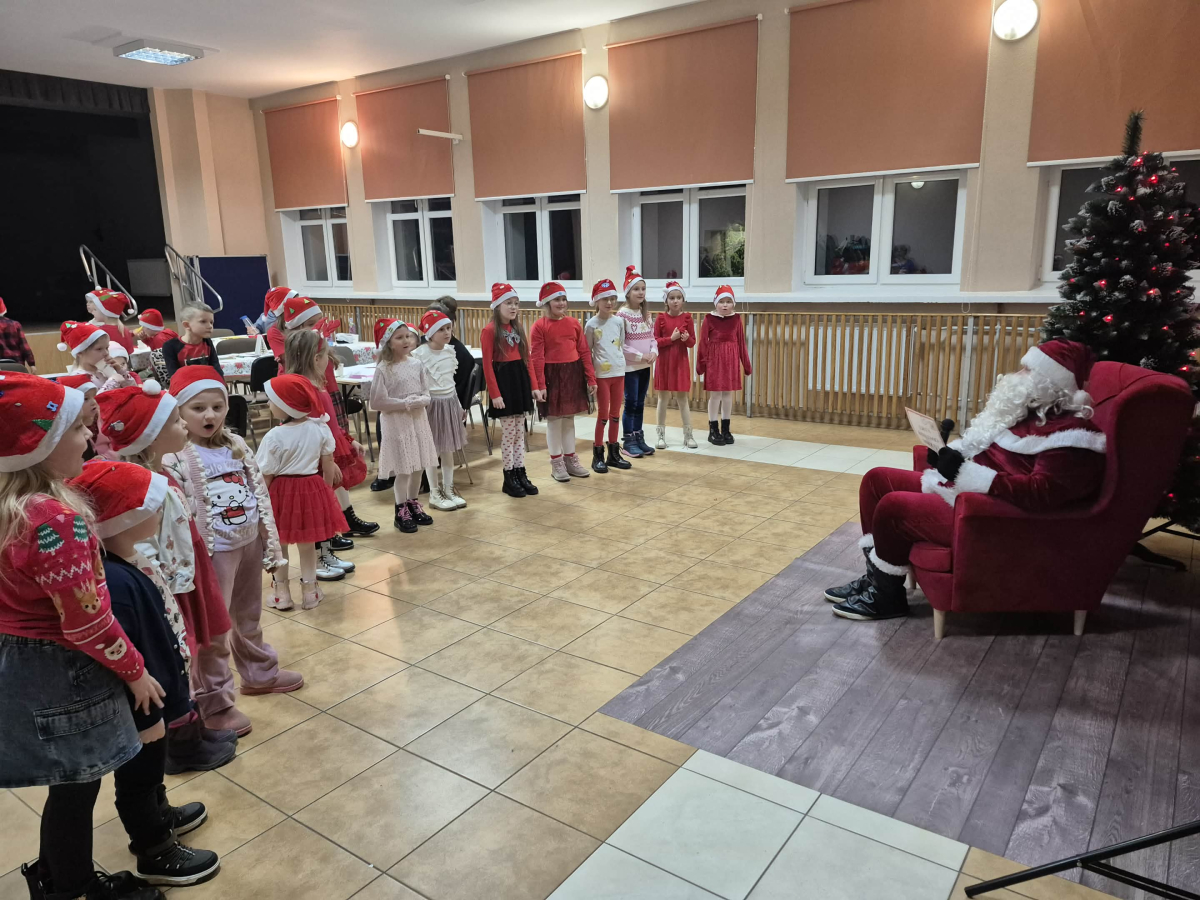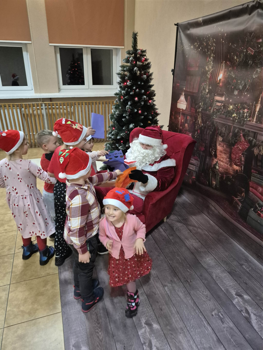 Po tym pełnym emocji epizodzie Grinch pognał dalej psocić w innym miejscu. Następnie dzieci wysłuchały pięknego teatrzyku Kamishibai o narodzeniu Jezusa, przeczytanego przez panią Żanetę. W sali zrobiło się spokojnie, cicho, a na twarzach dzieci pojawiło się skupienie i zachwyt. Tuż po teatrzyku nadszedł czas na taniec ze Śnieżynkami . Delikatne, zimowe rytmy, wirujące białe stroje i wspólna zabawa stworzyły prawdziwie bajkową atmosferę. Dzieci tańczyły z radością, tworząc razem piękny, zimowy obrazek. ✨ Dopiero później przyszedł moment na tworzenie listów do Świętego Mikołaja . Dzieci rysowały i pisały o swoich wymarzonych prezentach , a następnie z dumą dzieliły się swoim listem z innymi uczestnikami. Aby odpowiednio przywitać długo wyczekiwanego gościa, nauczyliśmy się też specjalnego wierszyka dla Świętego Mikołaja . Dzieci ćwiczyły go z ogromnym zaangażowaniem i… …w końcu przyszedł on — Święty Mikołaj! Z gromkim „Ho, ho, ho!” powitał wszystkich, wysłuchał przygotowanego wierszyka i oczywiście obdarował dzieci pięknymi prezentami.