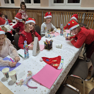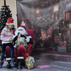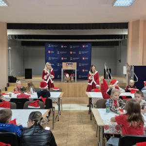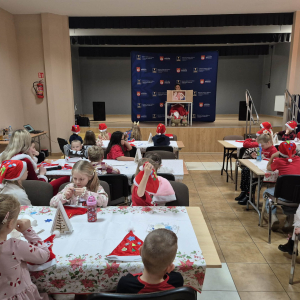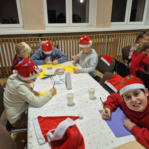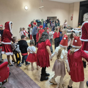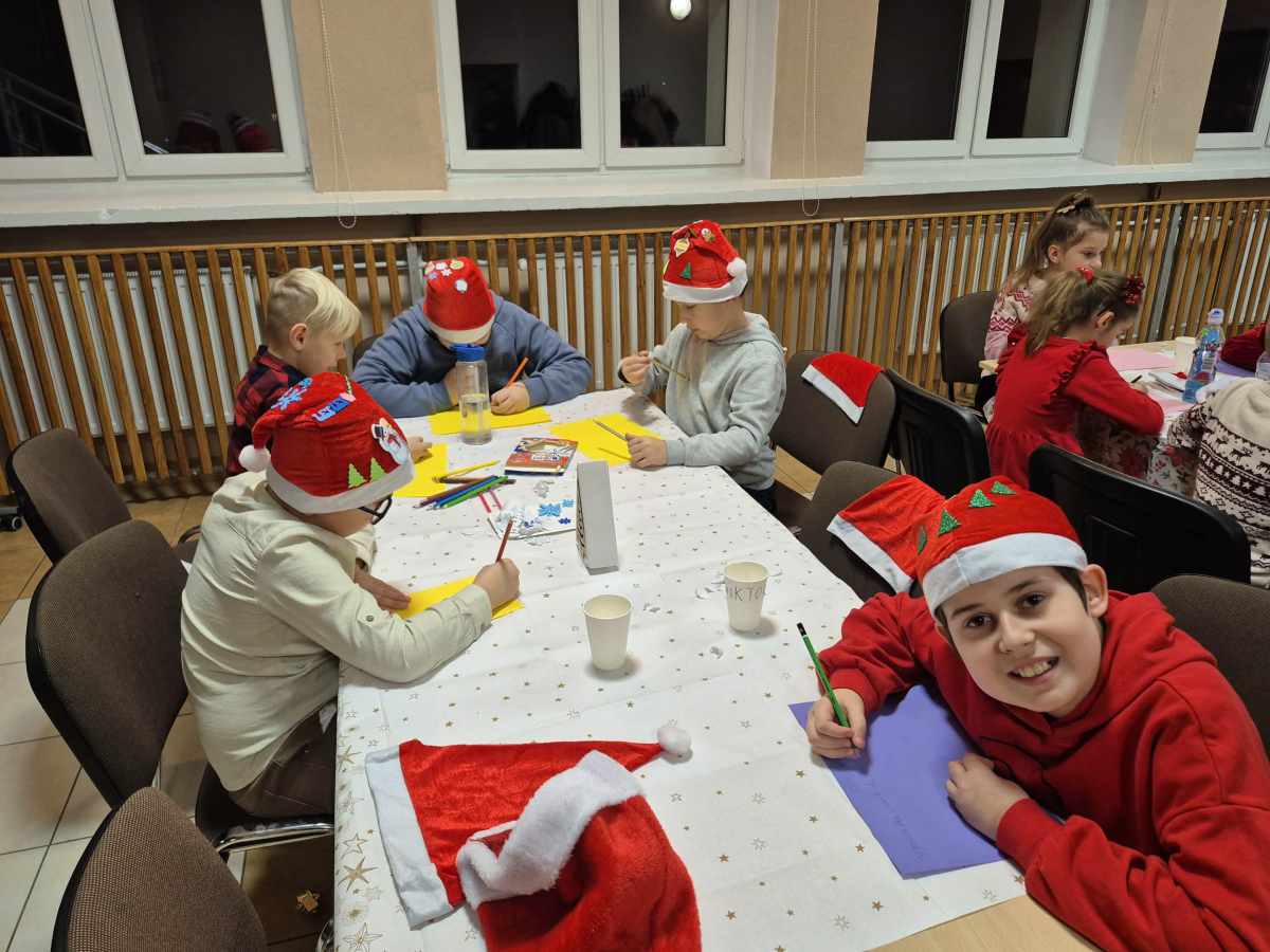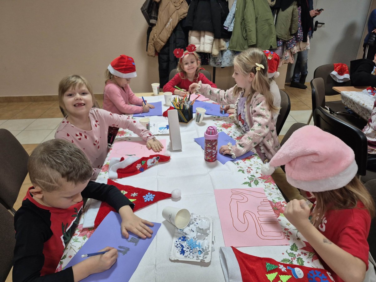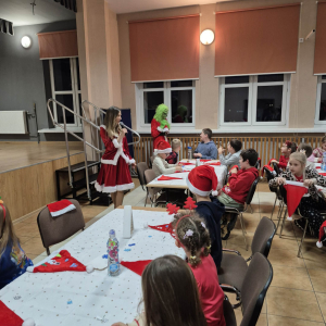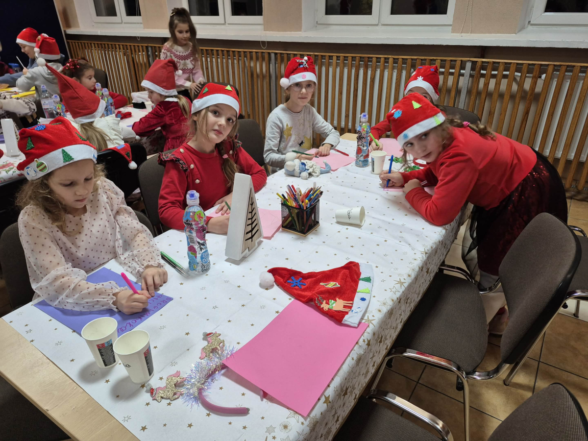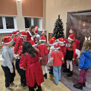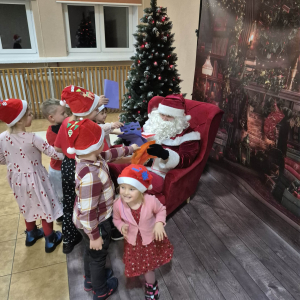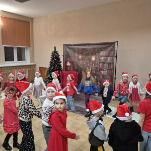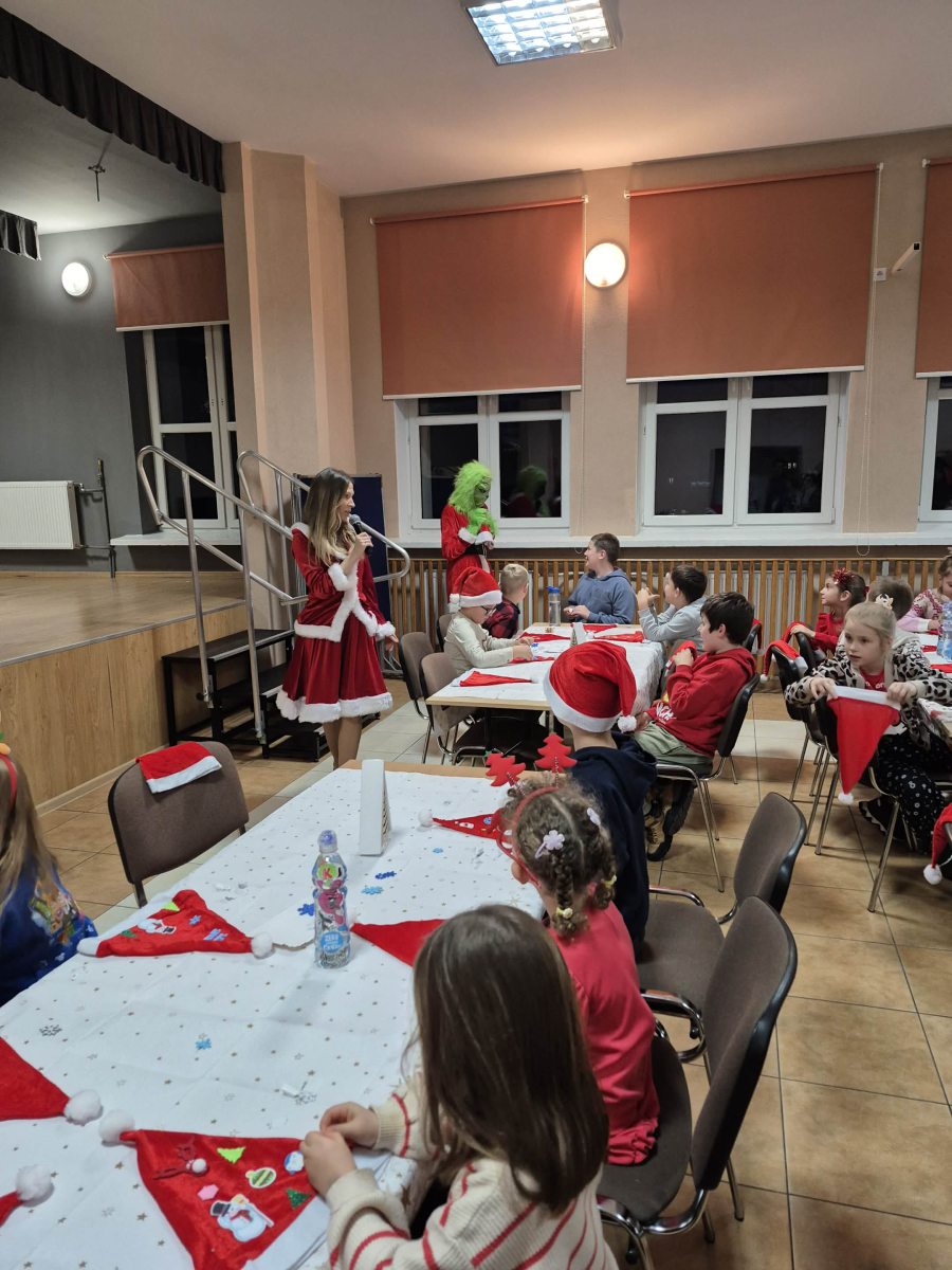 Po tym pełnym emocji epizodzie Grinch pognał dalej psocić w innym miejscu. Następnie dzieci wysłuchały pięknego teatrzyku Kamishibai o narodzeniu Jezusa, przeczytanego przez panią Żanetę. W sali zrobiło się spokojnie, cicho, a na twarzach dzieci pojawiło się skupienie i zachwyt. Tuż po teatrzyku nadszedł czas na taniec ze Śnieżynkami . Delikatne, zimowe rytmy, wirujące białe stroje i wspólna zabawa stworzyły prawdziwie bajkową atmosferę. Dzieci tańczyły z radością, tworząc razem piękny, zimowy obrazek. ✨ Dopiero później przyszedł moment na tworzenie listów do Świętego Mikołaja . Dzieci rysowały i pisały o swoich wymarzonych prezentach , a następnie z dumą dzieliły się swoim listem z innymi uczestnikami. Aby odpowiednio przywitać długo wyczekiwanego gościa, nauczyliśmy się też specjalnego wierszyka dla Świętego Mikołaja . Dzieci ćwiczyły go z ogromnym zaangażowaniem i… …w końcu przyszedł on — Święty Mikołaj! Z gromkim „Ho, ho, ho!” powitał wszystkich, wysłuchał przygotowanego wierszyka i oczywiście obdarował dzieci pięknymi prezentami.