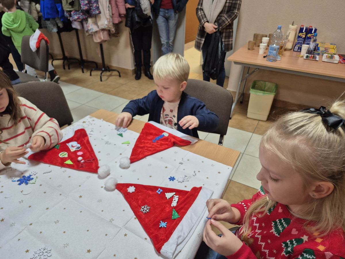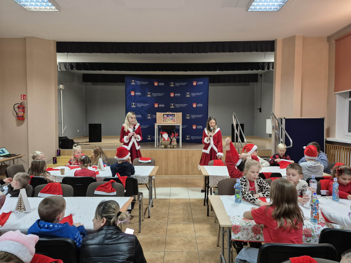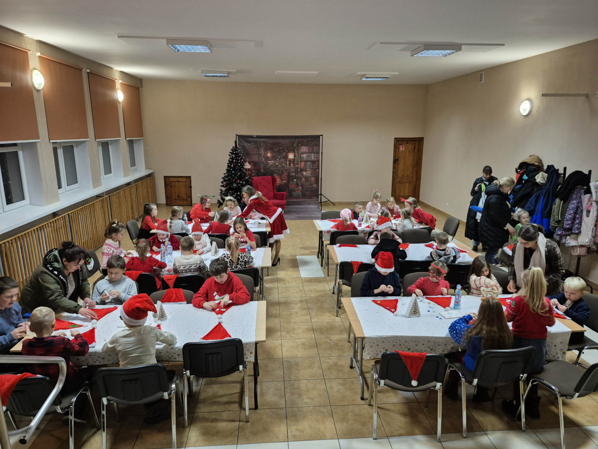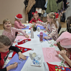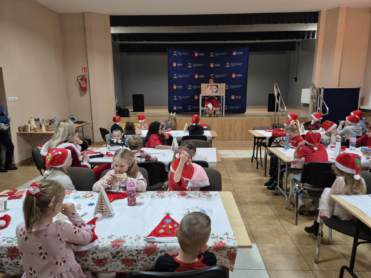 Od samego rana w naszej bibliotece panowała radosna i magiczna atmosfera. Dzieci rozpoczęły spotkanie od ozdabiania czapek Świętego Mikołaja — powstawały kolorowe, błyszczące, pełne fantazji czapeczki.