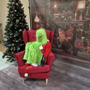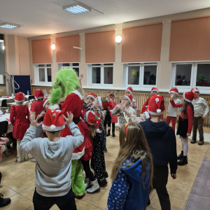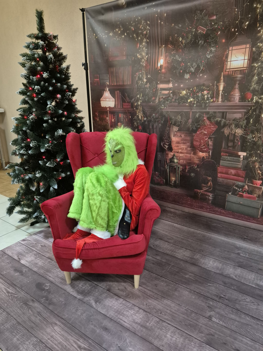 W trakcie tej twórczej zabawy pojawił się niezapowiedziany gość! Do sali wkroczył Grinch, który — jak na siebie przystało — zaczął robić dzieciom psikusy, rozśmieszać je i trochę dokuczać. Chował ozdoby, kręcił nosem i udawał niezadowolonego. Jednak magia świąt działa na każdego — dzieci zaprosiły go do wspólnej zabawy i po chwili Grinch tańczył razem z nimi!