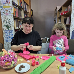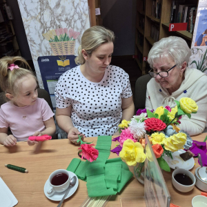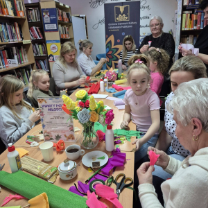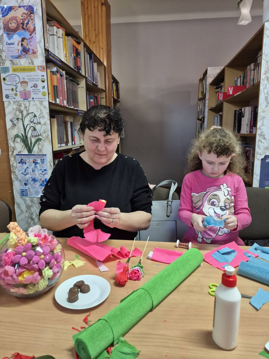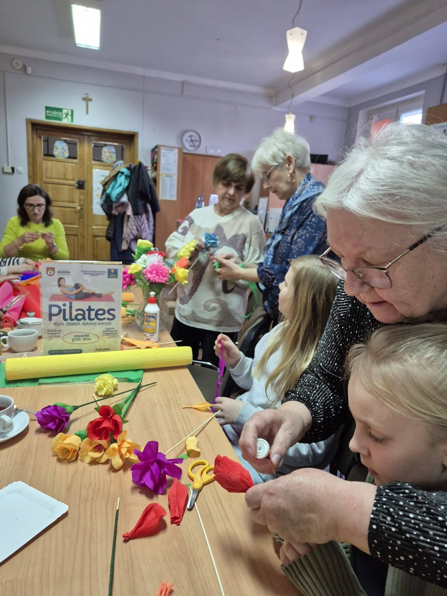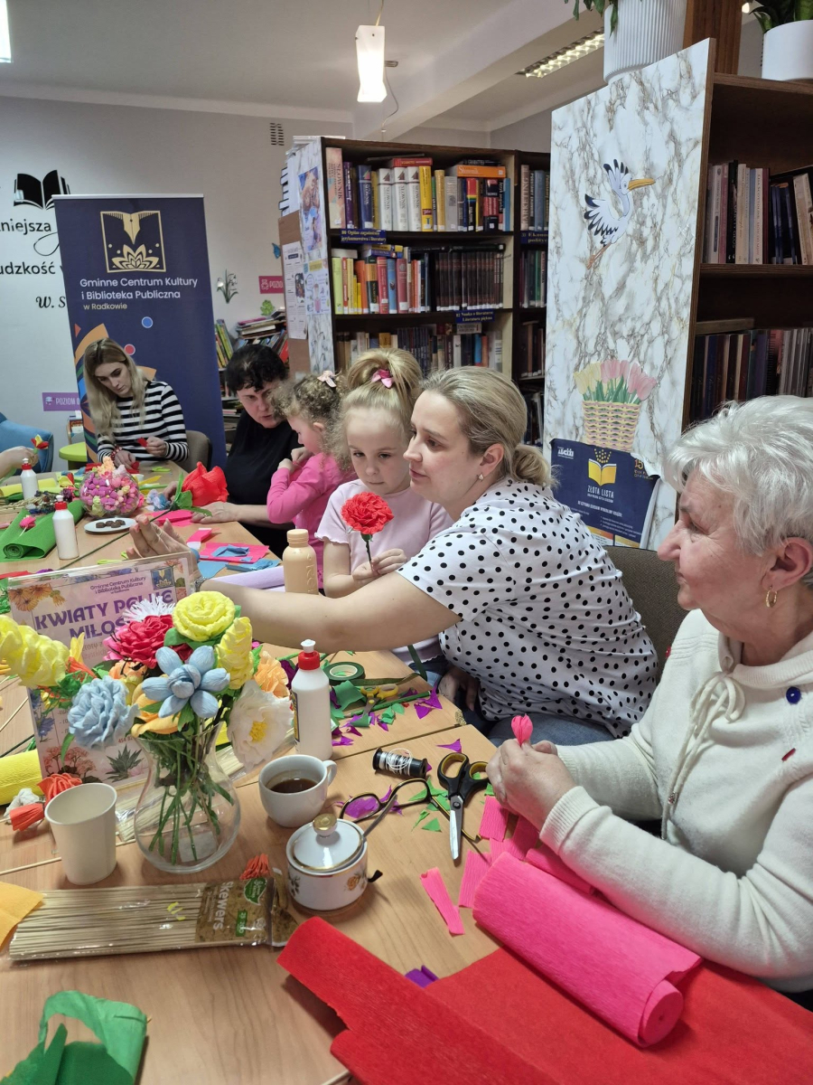 Pod czujnym okiem seniorek z Dyskusyjnego Klubu Książki w Radkowie powstawały prawdziwe małe dzieła sztuki. Kolorowa krepina zamieniała się w piękne kwiaty, a wspólna praca przyniosła mnóstwo radości i satysfakcji. Było to spotkanie pełne międzypokoleniowej energii Mamy, córki - KOBIETY – tworzyły, rozmawiały i spędzały czas w niezwykle serdecznej atmosferze. Przy filiżance kawy i wśród śmiechu powstawały nie tylko kwiaty, ale także piękne wspomnienia.